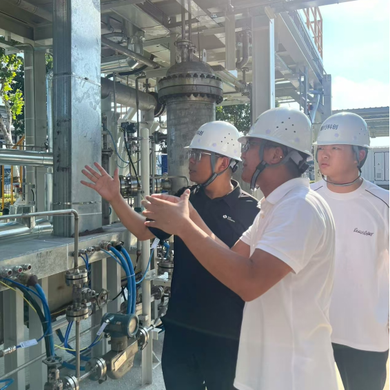 在技術(shù)人員的帶領(lǐng)下,我校師生團隊系統(tǒng)參觀了該項目的原料氣閥組、壓縮系統(tǒng)、反應(yīng)單元、中控室及分析檢測中心等關(guān)鍵區(qū)域,深入了解了甲醇合成催化劑的研發(fā)進展與工程流程。期間,師生圍繞二氧化碳資源化利用的技術(shù)瓶頸、產(chǎn)業(yè)化模式及人才需求等問題,與項目一線工程師展開深度交流。