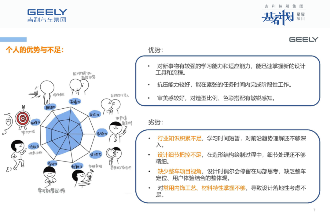 這次實(shí)習(xí)讓我接觸到真實(shí)項目,與一線設(shè)計師交流,深刻體會到設(shè)計是始于問題、忠于落地、將創(chuàng)意轉(zhuǎn)化為產(chǎn)品的過程。我認(rèn)識到自身不足,未來將繼續(xù)深入學(xué)習(xí),提升設(shè)計認(rèn)知與技能,為成為一名合格汽車設(shè)計師并加入吉利不斷努力。