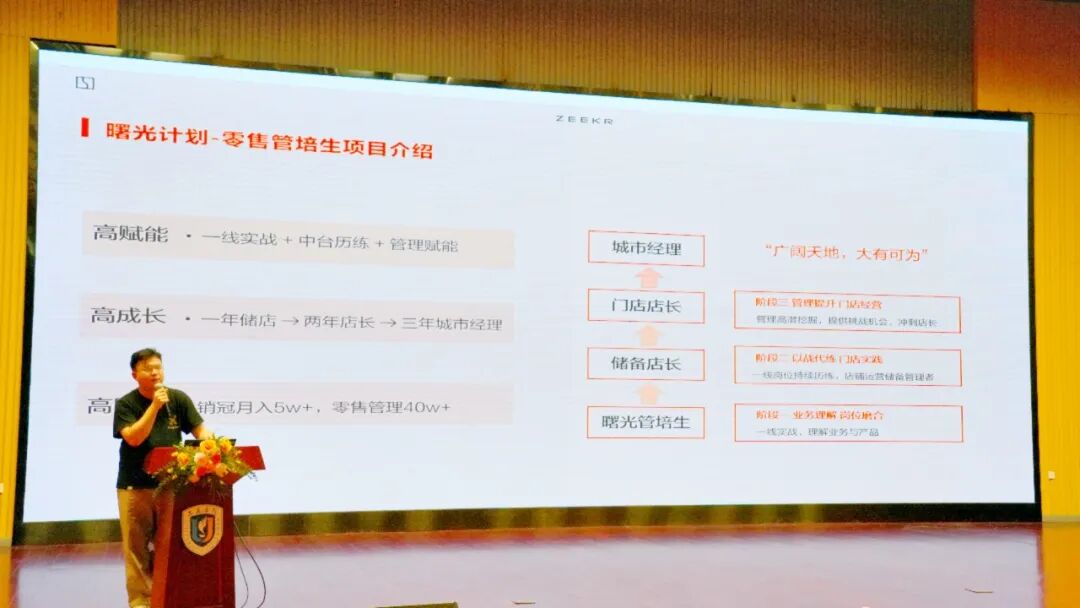 學習營銷專業(yè)的學生鄧瑩說,其實我來之前還挺迷茫,不知道大公司招什么,自己能做什么,直到吉利控股集團的校招宣講開始,這種“不確定”慢慢變成了“想試試”。極氪的管培生計劃更讓我動了心。陳老師提到學校2021屆的郝鳳英師姐,現(xiàn)在已經(jīng)是廣州門店店長,原來校友已經(jīng)在企業(yè)里面迅速成長,并且做出了成績,那我們也有機會!一年培養(yǎng)期就能沖儲備店長,還有帶薪實習機會,這種“看得見的晉升路徑”比模糊的“有發(fā)展空間”實在多了。
