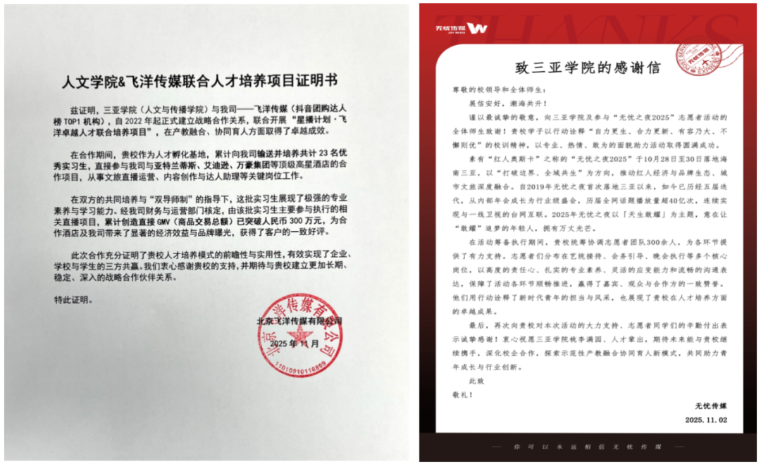 飛洋傳媒聯(lián)合項目培養(yǎng)證明書及感謝信