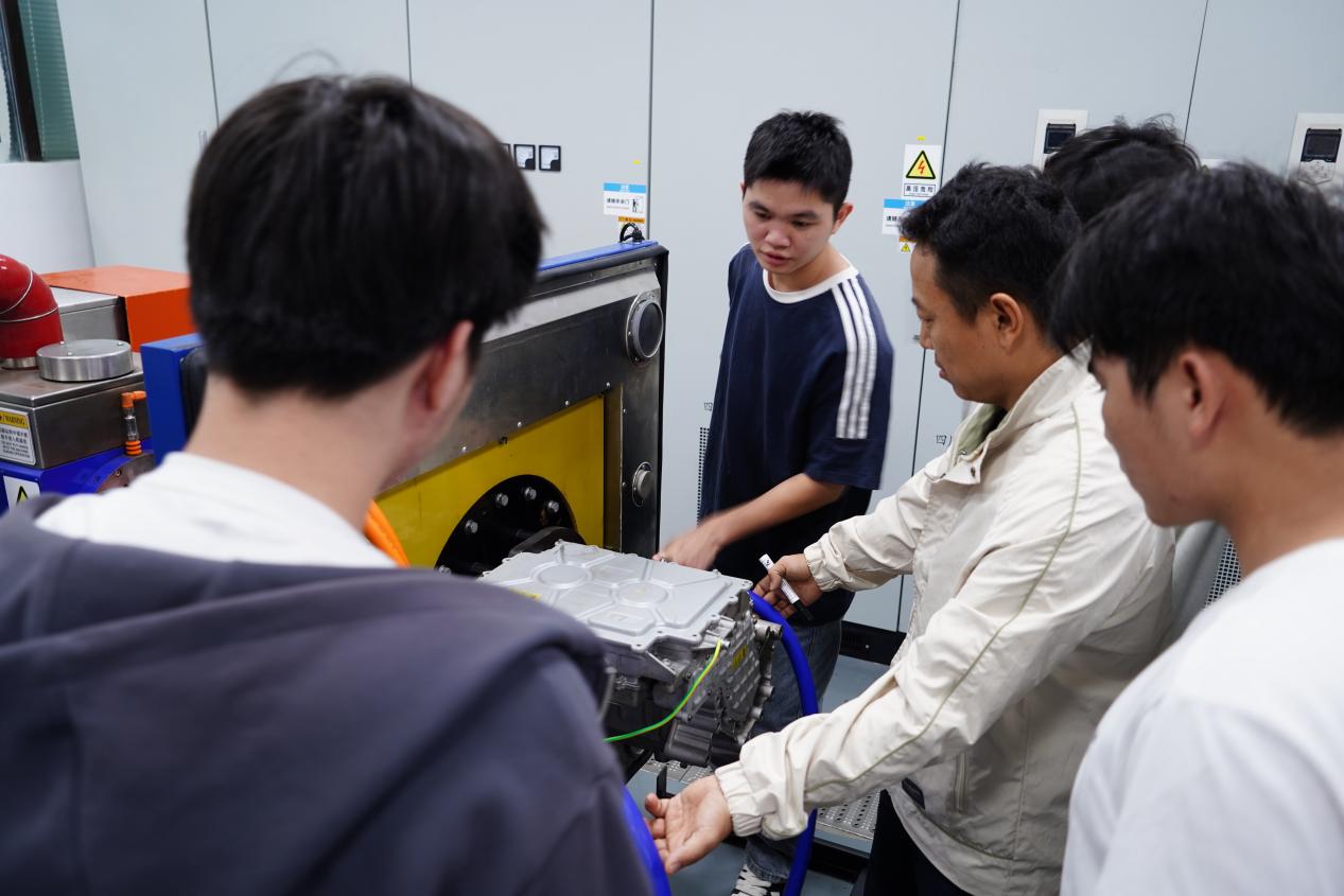 在吉利新能源與智能汽車產業(yè)學院的驅動電機測試實驗室,王良成老師正帶著學生調試測功機臺架。這里的核心測件由吉利提供,學校配套專業(yè)測試儀器,形成“校企資源互補”的實驗條件,讓學生直面產業(yè)真實設備。