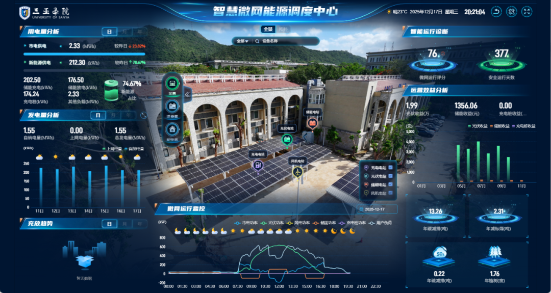 在零碳能源實驗室,謝瓊丹老師的項目團隊正忙著驗證綠色甲醇催化劑的催化效果。從光伏板收集綠色電能,到電解水制氫,再到甲醇合成反應,學生們全程參與“零碳甲醇”的全鏈條研發(fā)。實驗室隔壁的智慧微網能源調度中心,實時顯示著光伏供電、儲能充放電、碳減排量等數據,212.30WZ的新能源供電量較昨日提升70.67%,直觀呈現項目的環(huán)保成效。