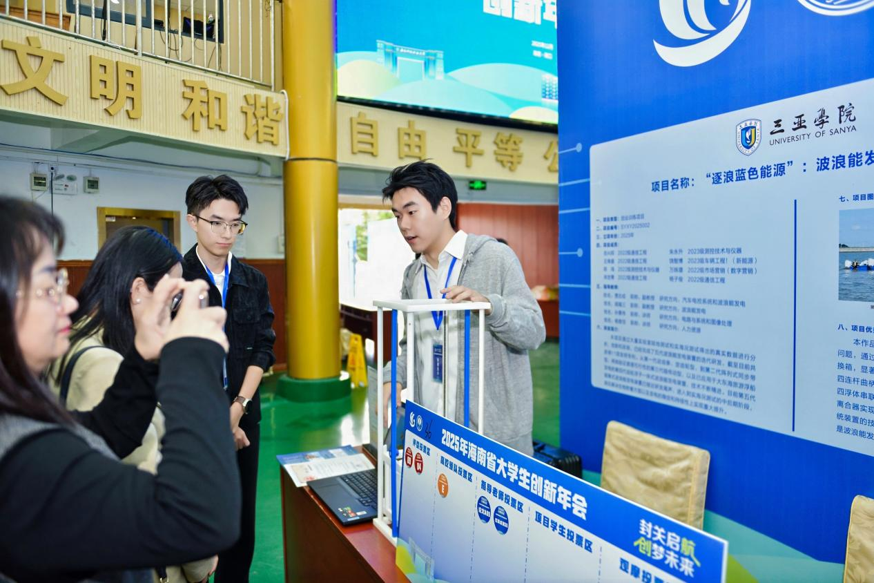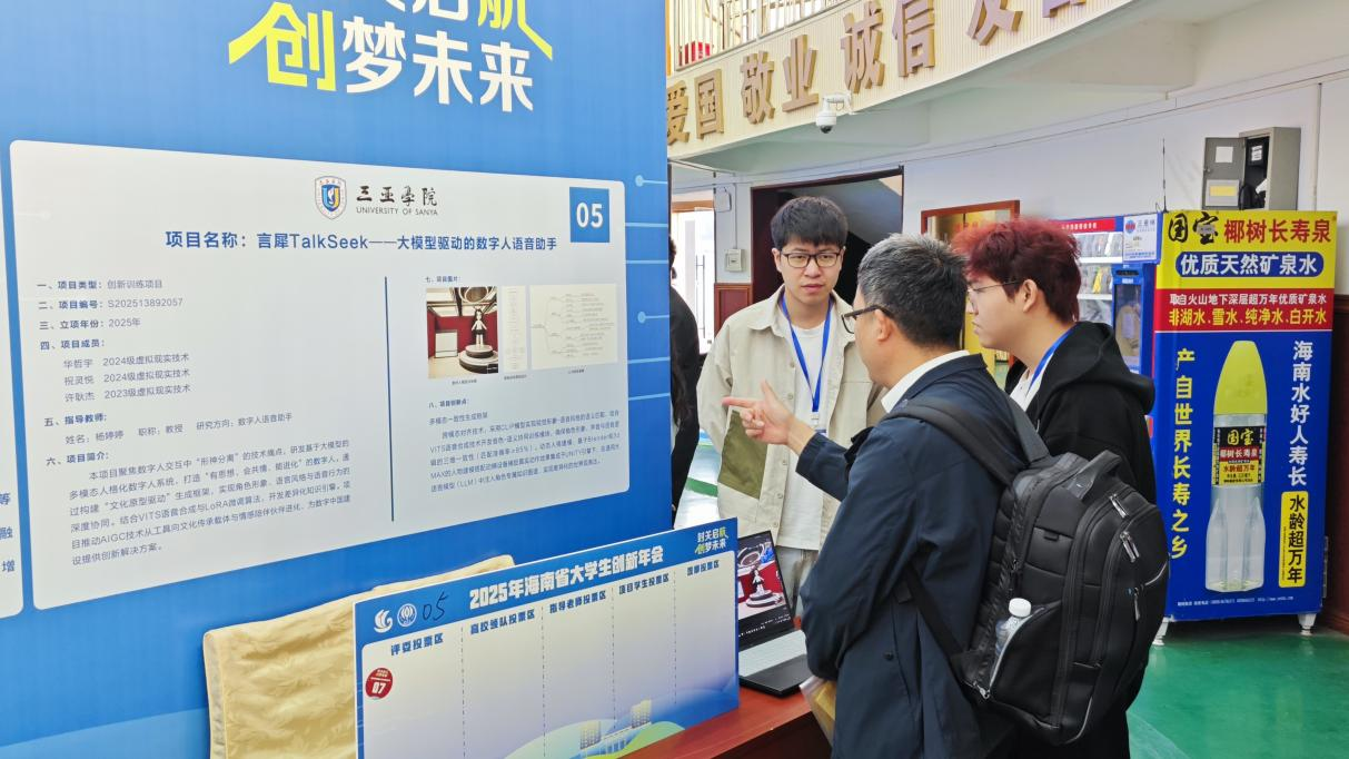 在成果展示環(huán)節(jié),學(xué)院通過(guò)實(shí)物、展板與路演等多種形式,生動(dòng)呈現(xiàn)了一批緊扣產(chǎn)業(yè)需求、具備應(yīng)用潛力的優(yōu)秀項(xiàng)目。這些成果覆蓋人工智能、海洋能源、智慧農(nóng)業(yè)、綠色金融等多個(gè)前沿領(lǐng)域:信智學(xué)院《言犀TalkSeek——大模型驅(qū)動(dòng)的數(shù)字人語(yǔ)音助手》聚焦人機(jī)交互前沿;汽車(chē)學(xué)院《“逐浪藍(lán)色能源”:波浪能發(fā)電裝置的創(chuàng)新研發(fā)》積極響應(yīng)海南海洋強(qiáng)省戰(zhàn)略;智慧農(nóng)業(yè)方向的《海洋漁業(yè)養(yǎng)殖無(wú)人機(jī)監(jiān)測(cè)系統(tǒng)》與面向國(guó)家“雙碳”目標(biāo)的《企業(yè)雙碳管理實(shí)訓(xùn)平臺(tái)》等項(xiàng)目,均體現(xiàn)出鮮明的現(xiàn)實(shí)導(dǎo)向和跨學(xué)科融合特色。