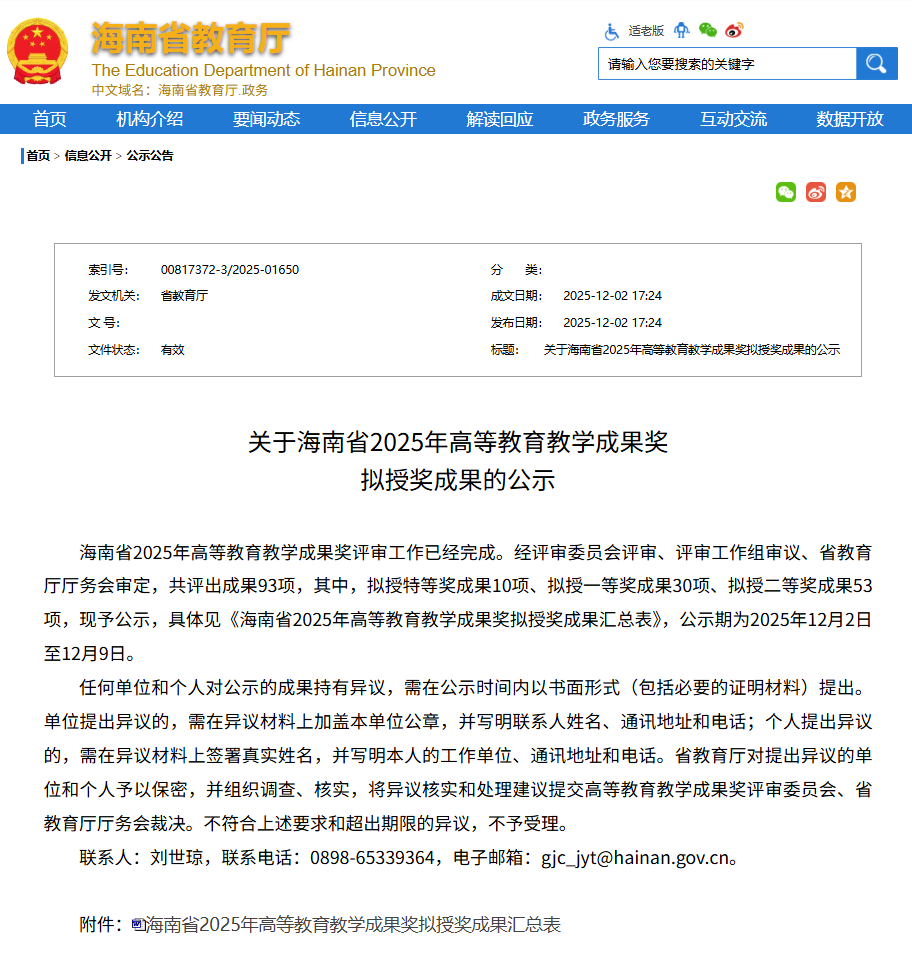 海南省教學(xué)成果獎(jiǎng)公示