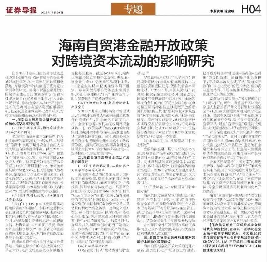 盛寶金融科技商學(xué)院同樣碩果累累。王良斌同學(xué)參與撰寫的《“兩重”“兩新”海南省金融精準(zhǔn)支持機(jī)制研究》,為省級戰(zhàn)略落地提供專業(yè)思路。鄭軼彬立足自貿(mào)港支付領(lǐng)域現(xiàn)狀,通過實(shí)地調(diào)研與理論分析,為行業(yè)高質(zhì)量發(fā)展貢獻(xiàn)青年智慧。